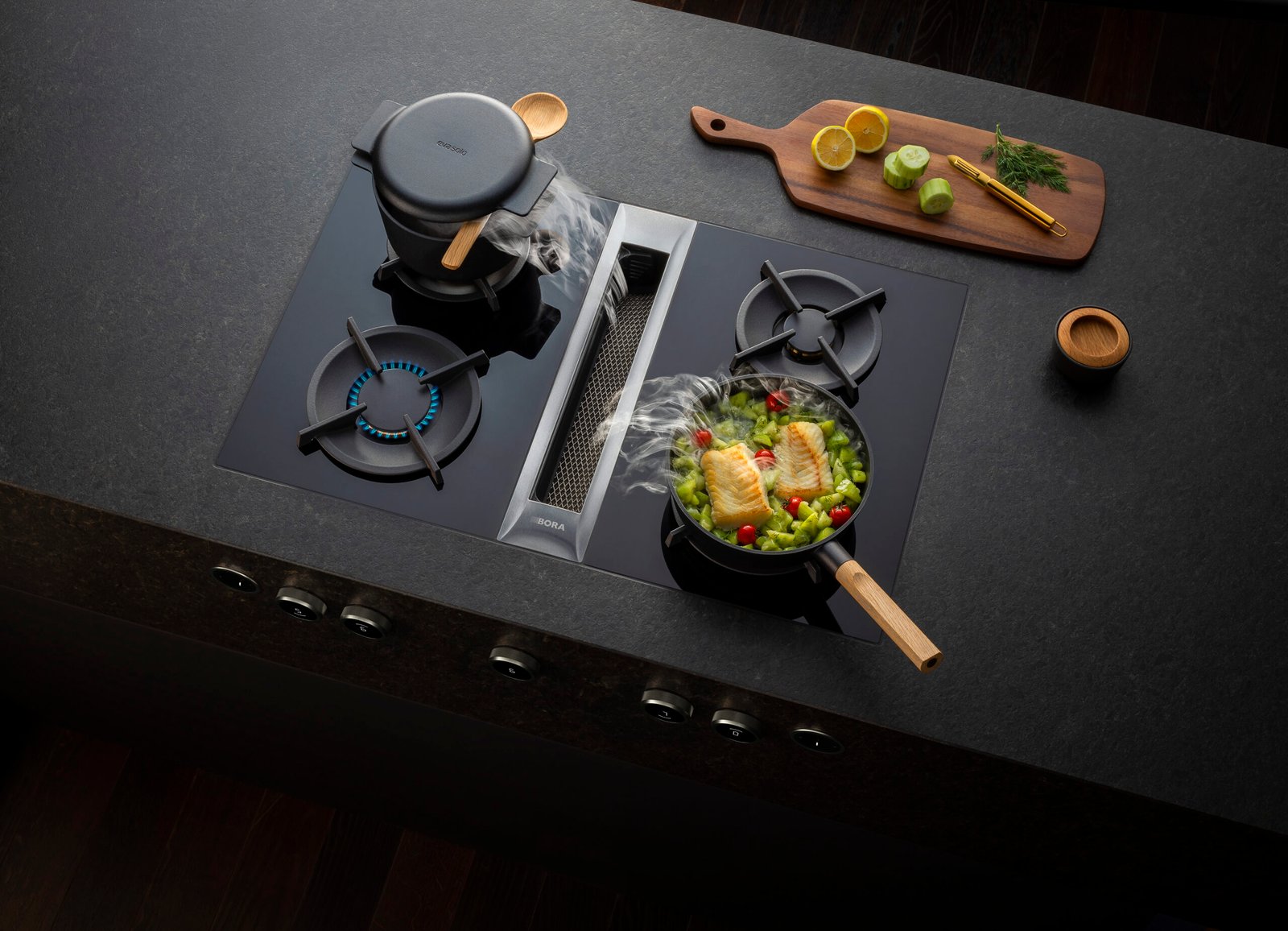 A vented hob performs dual functions within one unit. It heats saucepans by induction. The steam is sucked downwards by an integrated extractor. Air moves through a filter system or ducting route. This prevents vapour from rising. It reduces spread across the kitchen.