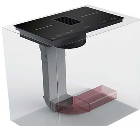 The hob surface can be flush with the worktop or top mounted. The extractor sits in the centre or rear of the hob. The ventilation unit then goes inside the base cabinet below, allowing space for the motor, filters, and pipework. The system removes the need for an overhead hood. This clears the ceiling line, improving the look of the room.
