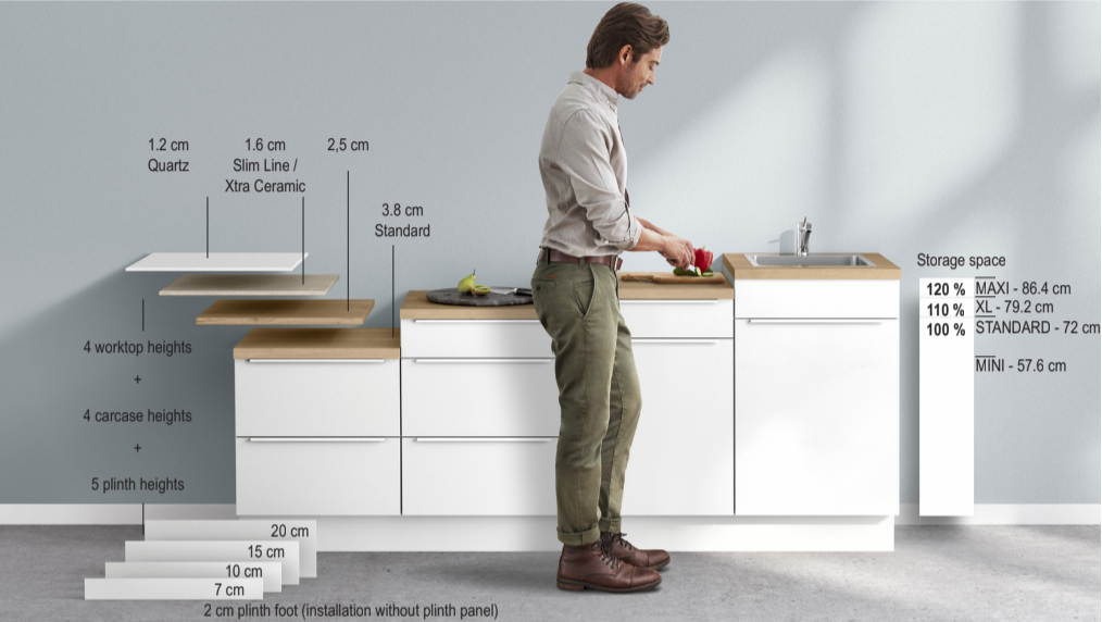 - Different plinth heights and worktop thicknesses