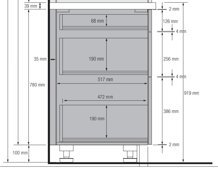 - 800 mm to 1000 mm wide drawers for large pans and crockery
